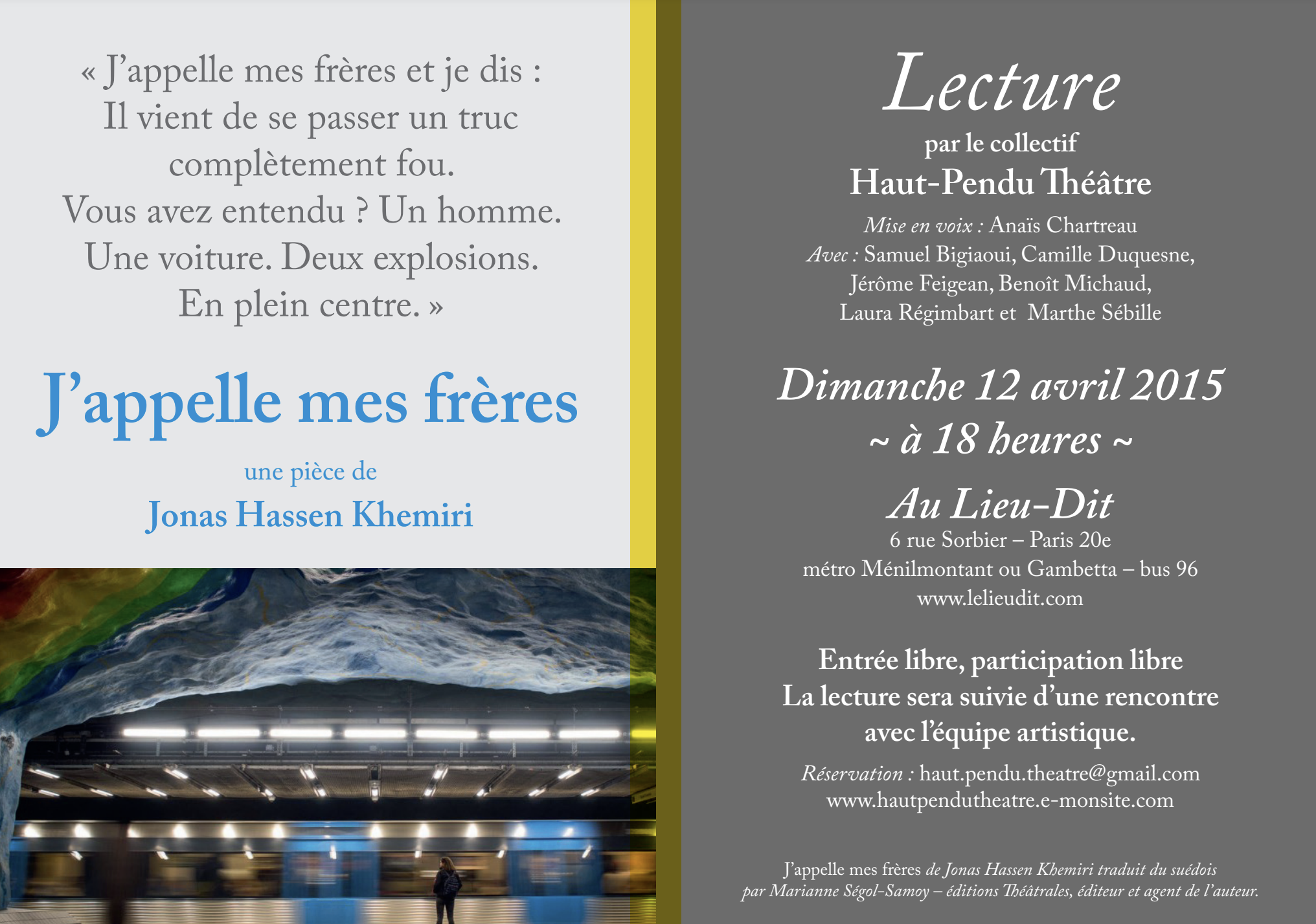 Lecture : « J’appelle mes frères » Une pièce de Jonas Hassen Khemiri
