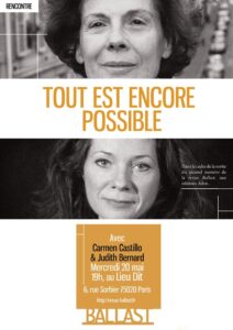 À l’occasion de la sortie du numéro 2 de sa revue papier, la revue Balast organise une rencontre entre Carmen Castillo, réalisatrice franco-chilienne (ancienne militante du MIR, expulsée par Pinochet, et collègue de Salvador Allende), et Judith Bernard, cofondatrice du site Hors-Série et metteuse en scène (elle a, notamment, adapté le travail de l’économiste Frédéric Lordon). Avec, pour thème, le titre d’un ouvrage de Daniel Bensaïd : « Tout est encore possible ».